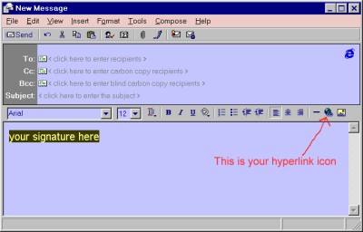 That's it! It's that easy. You'll notice the area you had highlighted is now underlined. That's because it's now a hyperlink! The link won't work until the message has been sent/posted. To test it first yourself, send it to either yourself or your drafts folder. To add the same kind of hyperlinks to your automatic signature, You can follow these same instructions with your signature (see Tip # 7) while in Front Page Express. FPE also has a paper clip hyperlink icon, and it's used the same way. If you have IE, you probably also have Front Page Express (FPE), a free program that with IE4+. (If you can't find it, click on your IE help menu and choose 'Product Updates'. You'll find it there) |